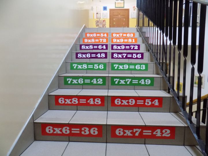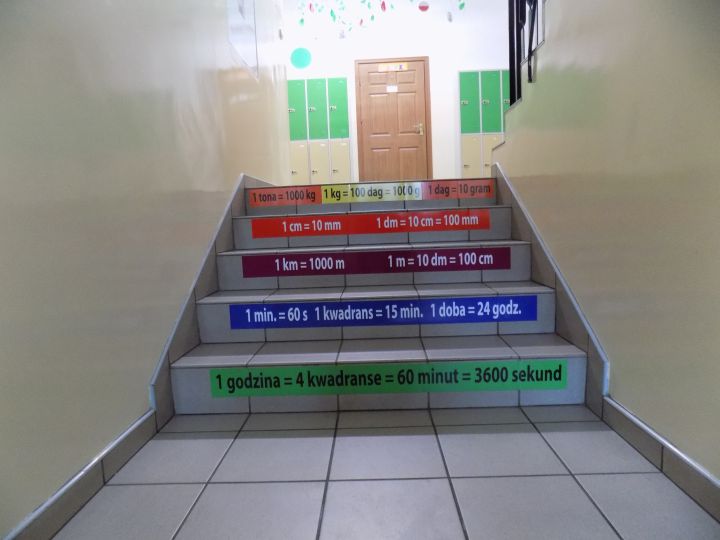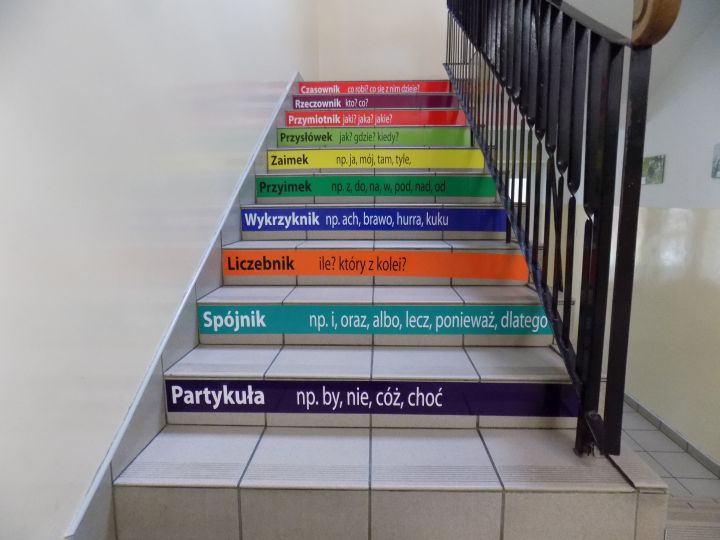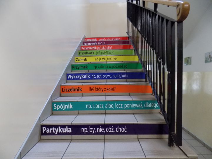 Dzięki nagrodzie jaką uzyskaliśmy za udział w Powiatowym Konkursie Ekologicznym zakupiliśmy naklejki na schody. Teraz jest nie tylko bardziej kolorowo, ale idąc na zajęcia z matematyki możemy powtórzyć tabliczkę mnożenia. Części mowy i zdania są dla nas bardziej „widoczne”.
