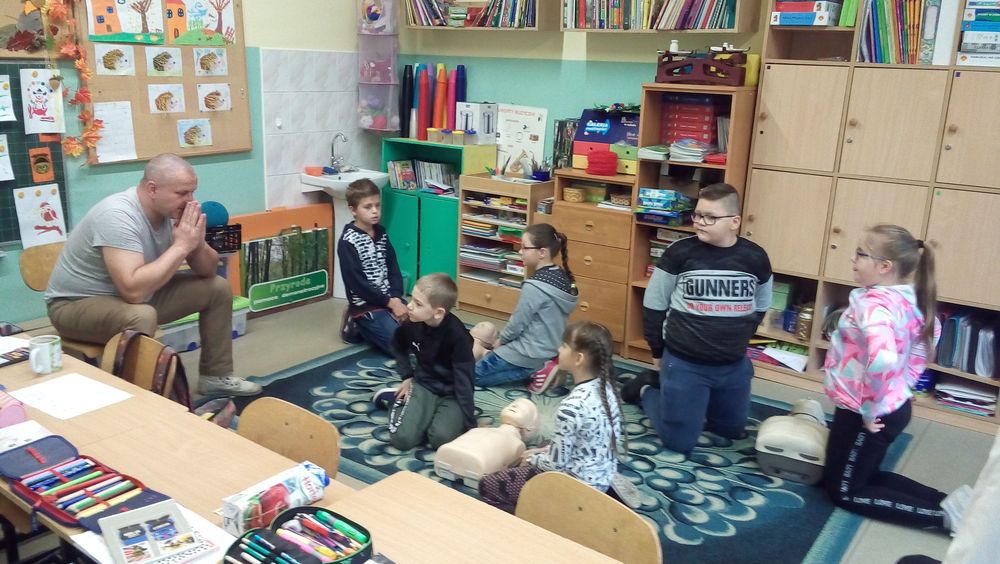 Uczniów klas młodszych edukują wolontariusze z oddziału ratunkowego w Bartoszycach, Jednym z nich jest Pan Bartłomiej Chilmanowicz.